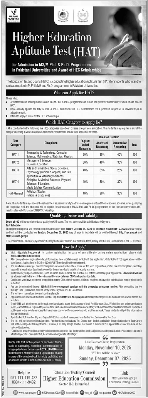 Higher Education Commission HEC Admission Test 2025 announce the Contract career opportunities for the post of See Below Ad in Federal, Islamabad for the fresh and experienced candidates on Contract basis who have Check Advertisement degree. Posted date of this post is 23/10/2025 and the last date is 10/11/2025. if you are eligible for this job apply before due date.