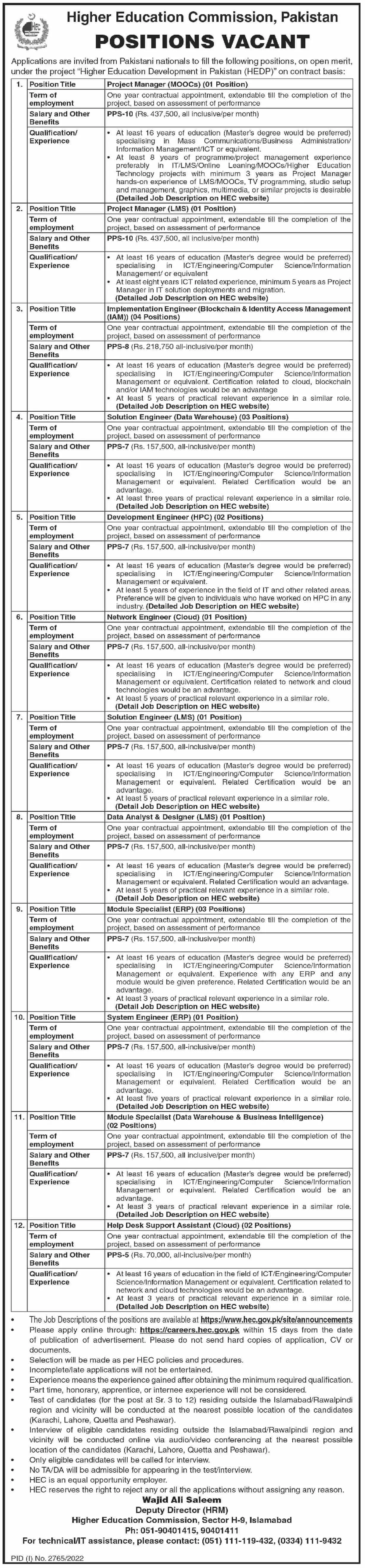 - Applications are invited for the position of (Implementation Engineer, Solution Engineer, Development Engineer, Network Engineer, Data Analyst & Designer, Module Specialist, System Engineer, Help Desk Support Assistant, Assistant Attestation Officer, Program Specialist – Academics, Project Director, Regional Coordinator, Project Manager, Technical Monitoring Officer, Project Officer, Accounts Officer, Assistant Manager Accounts, Senior Deputy Program Specialist, Deputy Program Specialist, Manager Research Grants, IT Specialist, and Assistant Program Specialist).
