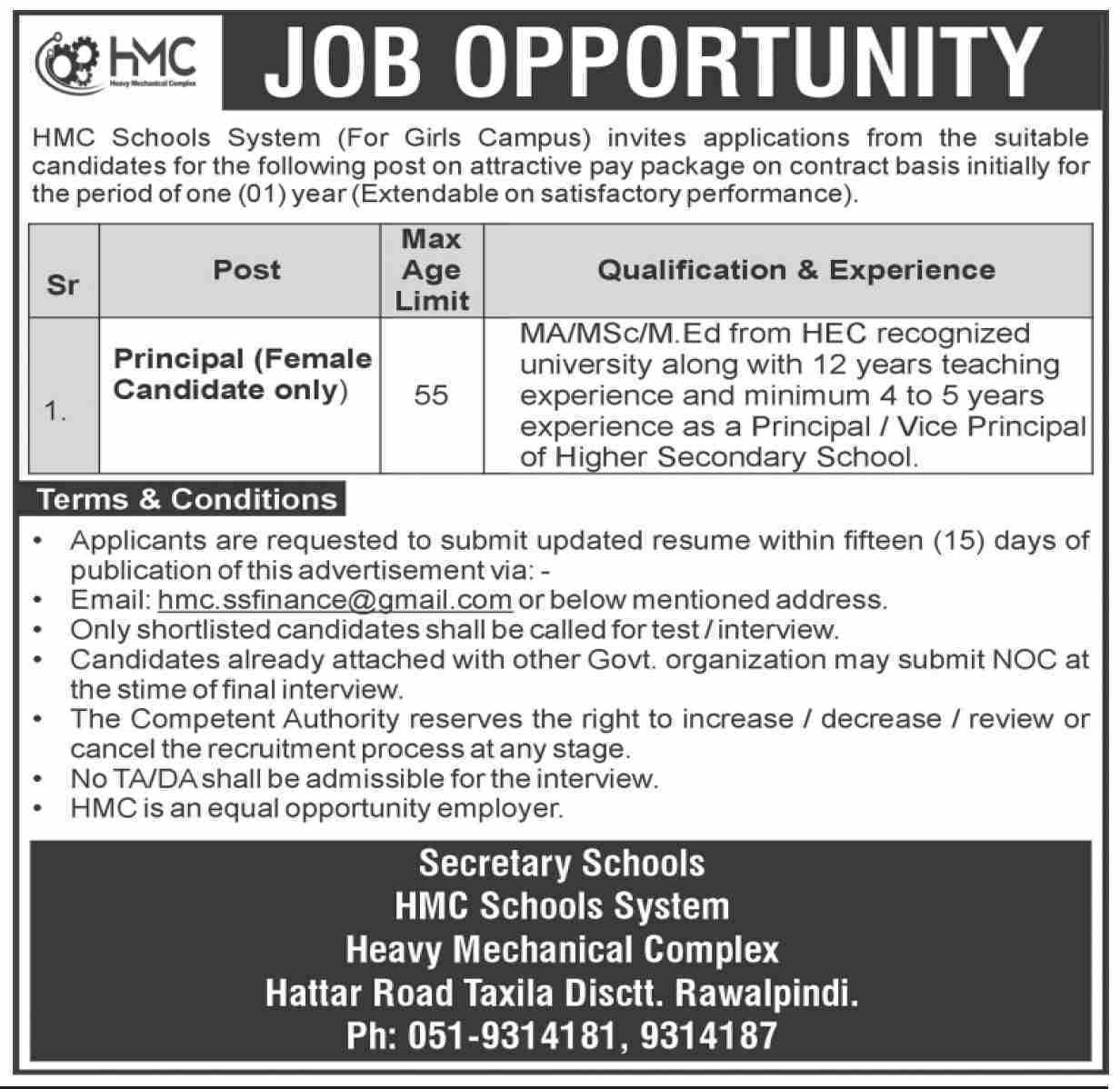 HMC Schools System Heavy Mechanical Complex Jobs 2025 announce the Contract career opportunities for the post of See Below Ad in Punjab for the fresh and experienced candidates on Contract basis who have Check Advertisement degree. Posted date of this post is 11/09/2025 and the last date is 24/09/2025. if you are eligible for this job apply before due date.