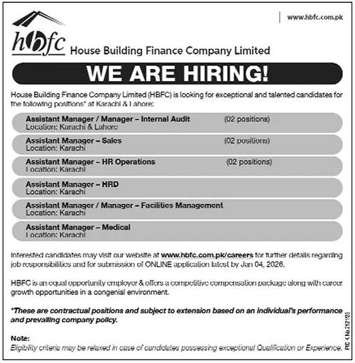 House Building Finance Company Limited HBFCL Jobs 2026 announce the Contract career opportunities for the post of See Below Ad in Sindh, Karachi for the fresh and experienced candidates on Contract basis who have Check Advertisement degree. Posted date of this post is 21/12/2025 and the last date is 04/01/2026. if you are eligible for this job apply before due date.