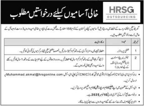 HRSG Outsourcing Pvt Limited Karachi Jobs 2025 announce the Contract career opportunities for the post of See Below Ad in Sindh, Karachi for the fresh and experienced candidates on Contract basis who have Check Advertisement degree. Posted date of this post is 05/11/2025 and the last date is 10/11/2025. if you are eligible for this job apply before due date.