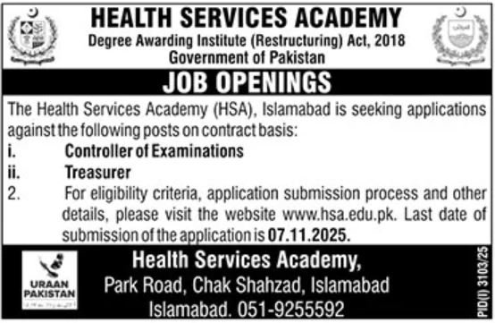HSA Health Services Academy Islamabad Jobs 2025 announce the Contract career opportunities for the post of See Below Ad in Federal, Islamabad for the fresh and experienced candidates on Contract basis who have Check Advertisement degree. Posted date of this post is 16/10/2025 and the last date is 07/11/2025. if you are eligible for this job apply before due date.