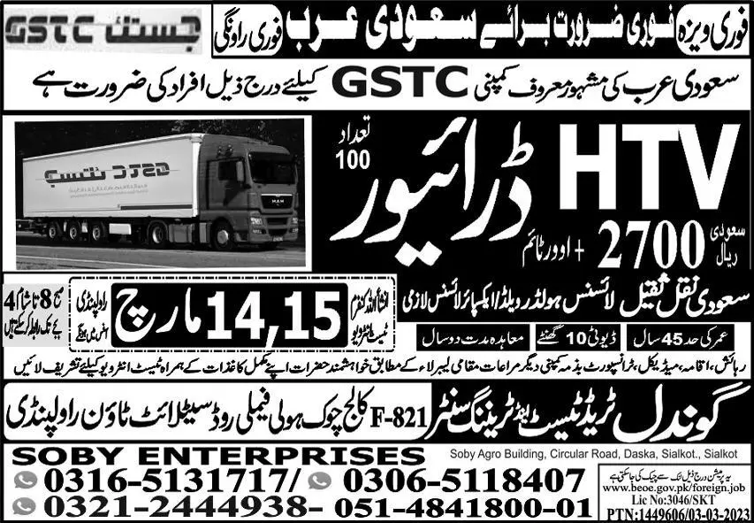 HTV Driver Jobs in Saudi Arabia 2023 announce the Contract career opportunities for the post of See Below Ad in Saudi Arabia for the fresh and experienced candidates on Contract basis who have Check Advertisement degree. Posted date of this post is 12/03/2023 and the last date is 15/03/2023. if you are eligible for this job apply before due date.
