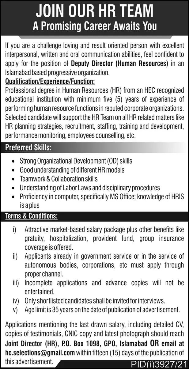 Human Resources Islamabad Based Progressive Organization job announce the Contract career opportunities for the post of See Below Ad in Islamabad for the fresh and experienced candidates on Contract basis who have Check Advertisement degree. Posted date of this post is 12/12/2021 and the last date is 27/12/2021. if you are eligible for this job apply before due date.