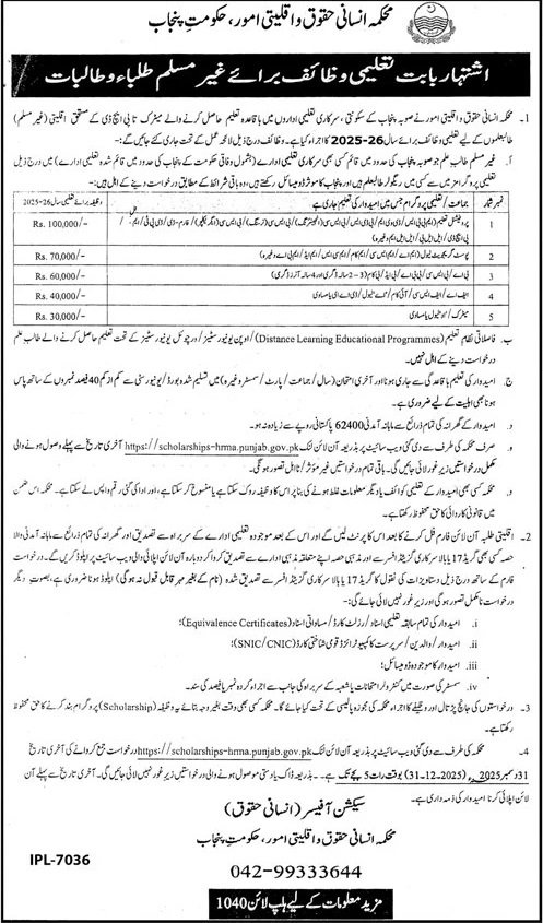 Human Rights and Minorities Affairs Department Scholarships announce the Contract career opportunities for the post of See Below Ad in Punjab for the fresh and experienced candidates on Contract basis who have Check Advertisement degree. Posted date of this post is 07/12/2025 and the last date is 31/12/2025. if you are eligible for this job apply before due date.