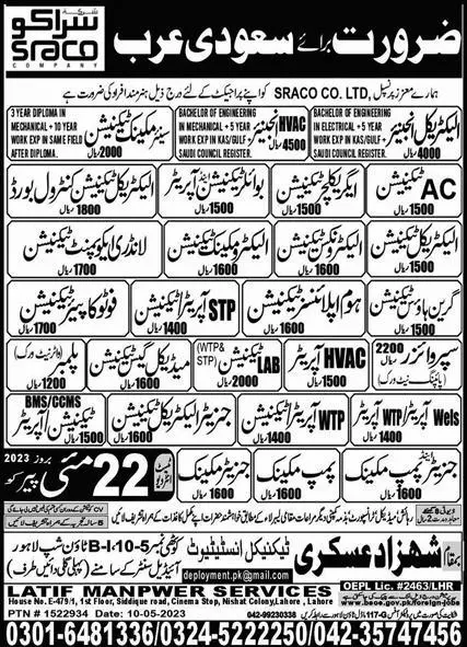 HVAC Operator & Electro Mechanic Technician Jobs 2023 announce the Contract career opportunities for the post of See Below Ad in Saudi Arabia for the fresh and experienced candidates on Contract basis who have Check Advertisement degree. Posted date of this post is 20/05/2023 and the last date is 22/05/2023. if you are eligible for this job apply before due date.