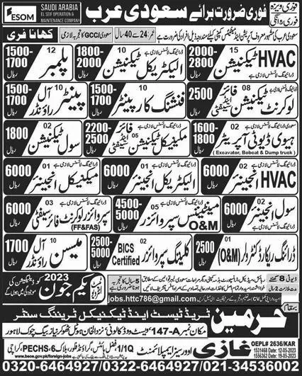 HVAC Technician Plumber & Civil Technician Jobs In KSA announce the Contract career opportunities for the post of See Below Ad in Saudi Arabia for the fresh and experienced candidates on Contract basis who have Check Advertisement degree. Posted date of this post is 25/05/2023 and the last date is 01/06/2023. if you are eligible for this job apply before due date.