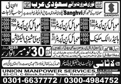 Hydraulic Mechanic & Mobile Crane Operator Jobs 2025 announce the Contract career opportunities for the post of See Below Ad in Saudi Arabia for the fresh and experienced candidates on Contract basis who have Check Advertisement degree. Posted date of this post is 29/11/2025 and the last date is 30/11/2025. if you are eligible for this job apply before due date.
