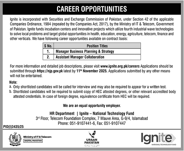 Ignite National Technology Fund Islamabad Jobs 2025 announce the Contract career opportunities for the post of See Below Ad in Federal, Islamabad for the fresh and experienced candidates on Contract basis who have Check Advertisement degree. Posted date of this post is 26/10/2025 and the last date is 11/11/2025. if you are eligible for this job apply before due date.
