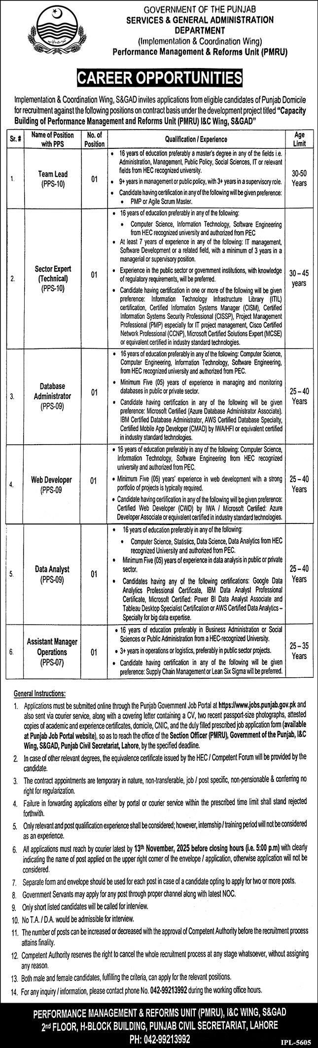 Implementation & Coordination Wing, S&GAD invites applications from eligible candidates of Punjab Domicile for recruitment against the following positions on contract basis under the development project titled “Capacity Building of Performance Management and Reforms Unit (PMRU) I&C Wing, S&GAD”