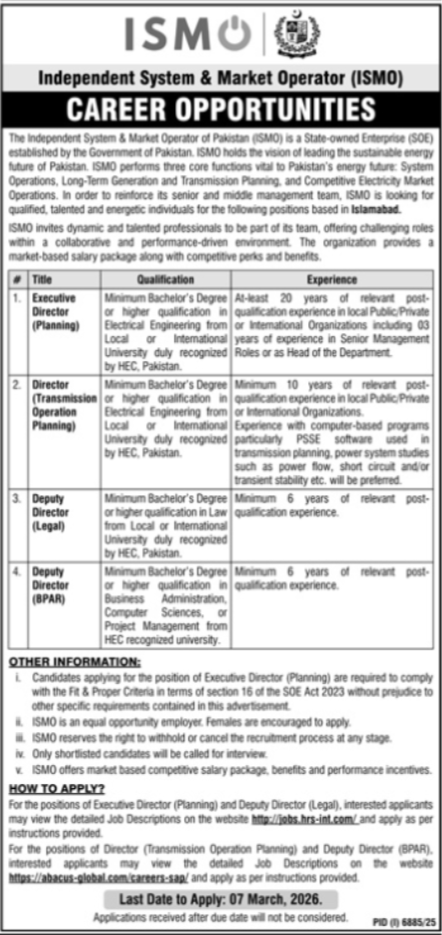 Independent System & Market Operator of Pakistan Jobs 2026 announce the Contract career opportunities for the post of See Below Ad in Federal, Islamabad for the fresh and experienced candidates on Contract basis who have Check Advertisement degree. Posted date of this post is 22/02/2026 and the last date is 07/03/2026. if you are eligible for this job apply before due date.