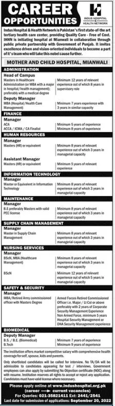Indus Hospital Health Network Jobs 2022 announce the Contract career opportunities for the post of See Below Ad in Punjab, Mianwali for the fresh and experienced candidates on Contract basis who have Check Advertisement degree. Posted date of this post is 11/09/2022 and the last date is 20/09/2022. if you are eligible for this job apply before due date.