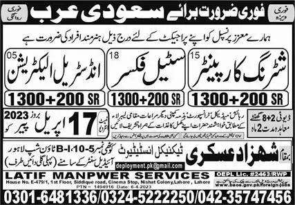 Industrial Electrician & Shuttering Carpenter Jobs 2023 announce the Contract career opportunities for the post of See Below Ad in Saudi Arabia for the fresh and experienced candidates on Contract basis who have Check Advertisement degree. Posted date of this post is 11/04/2023 and the last date is 17/04/2023. if you are eligible for this job apply before due date.