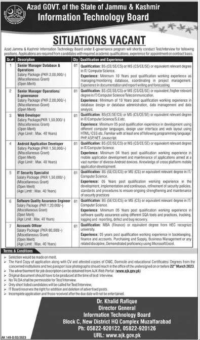 Information Technology Board Azad Jammu Kashmir Jobs 2023 announce the Contract career opportunities for the post of See Below Ad in Azad Jammu Kashmir, Muzaffarabad for the fresh and experienced candidates on Contract basis who have Check Advertisement degree. Posted date of this post is 15/03/2023 and the last date is 22/03/2023. if you are eligible for this job apply before due date.