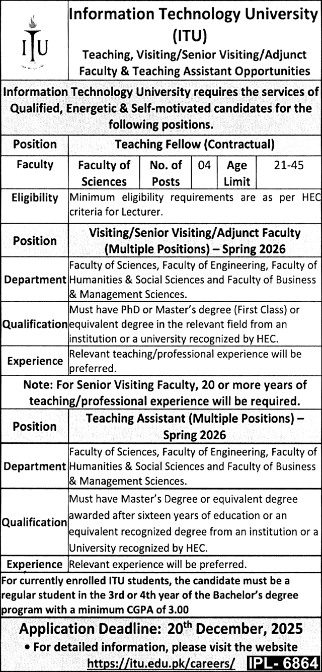 Information Technology University ITU Lahore Jobs 2025 announce the Contract career opportunities for the post of See Below Ad in Punjab, Lahore for the fresh and experienced candidates on Contract basis who have Check Advertisement degree. Posted date of this post is 02/12/2025 and the last date is 20/12/2025. if you are eligible for this job apply before due date.