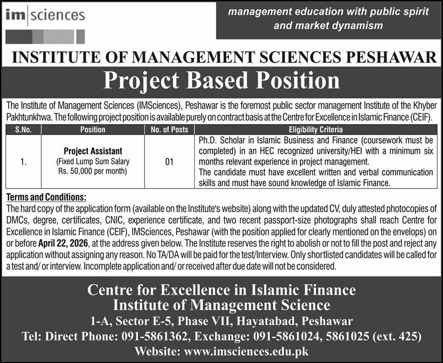 Institute Of Management Sciences IM Sciences Jobs 2026 announce the Contract career opportunities for the post of See Below Ad in Khyber Pakhtunkhwa, Peshawar for the fresh and experienced candidates on Contract basis who have Check Advertisement degree. Posted date of this post is 09/04/2026 and the last date is 22/04/2026. if you are eligible for this job apply before due date.