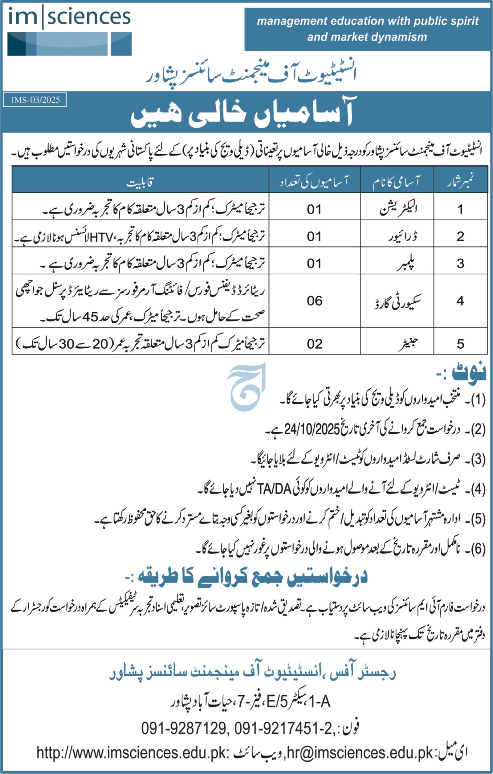 Institute of Management Sciences Peshawar Jobs 2025 announce the Contract career opportunities for the post of See Below Ad in Khyber Pakhtunkhwa, Peshawar for the fresh and experienced candidates on Contract basis who have Check Advertisement degree. Posted date of this post is 13/10/2025 and the last date is 24/10/2025. if you are eligible for this job apply before due date.