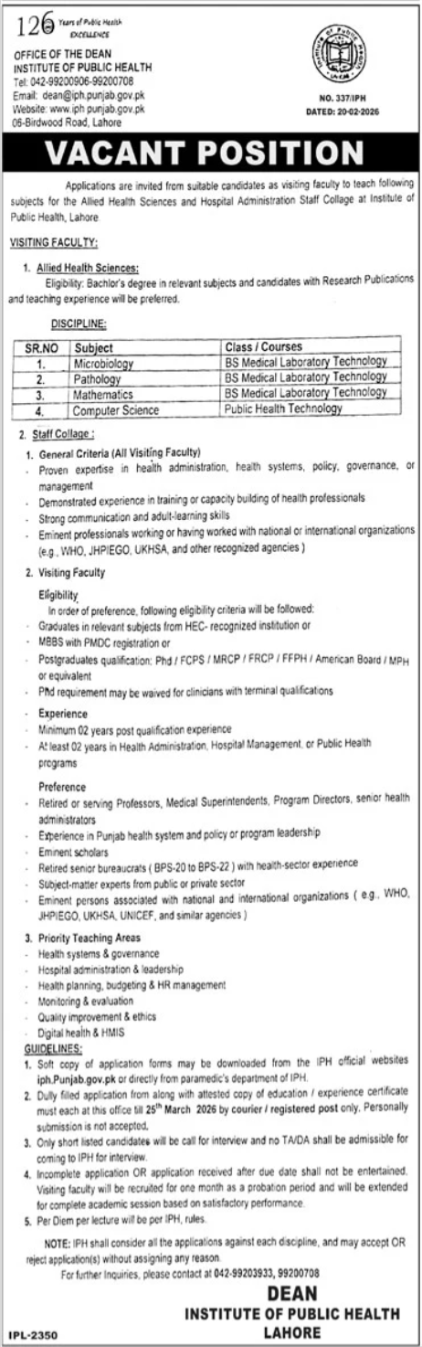 Institute of Public Health Lahore Jobs 2026 announce the Contract career opportunities for the post of See Below Ad in Punjab, Lahore for the fresh and experienced candidates on Contract basis who have Check Advertisement degree. Posted date of this post is 07/03/2026 and the last date is 25/03/2026. if you are eligible for this job apply before due date.