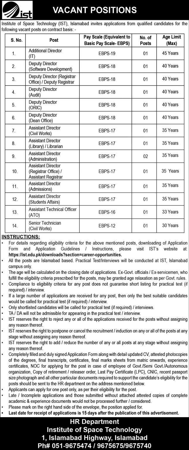 Institute of Space Technology (IST), Islamabad invites applications from qualified candidates for the following vacant posts on contract basis:
