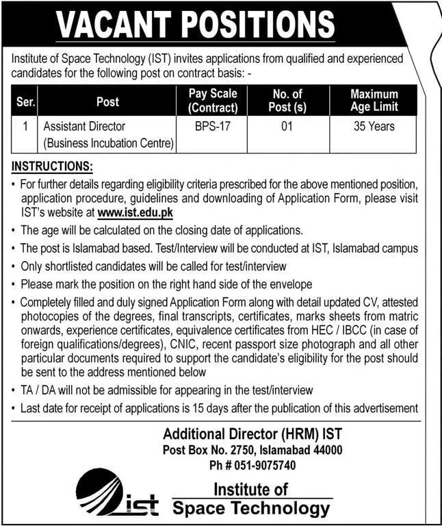 Institute Of Space Technology IST Jobs announce the Contract career opportunities for the post of See Below Ad in Federal, Islamabad for the fresh and experienced candidates on Contract basis who have Check Advertisement degree. Posted date of this post is 28/04/2022 and the last date is 13/05/2022. if you are eligible for this job apply before due date.
