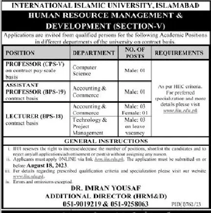 - Vacant posts including assistant professor, professor and lecturer are announced in International Islamic University Islamabad IIUI Islamabad, islamabad Islamabad Pakistan as per 6 August 2023 advertisement in daily Jang Newspaper. etc.