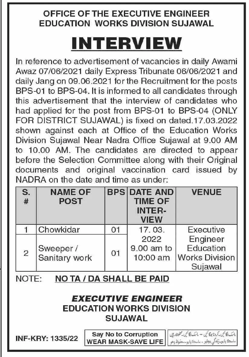 Interview Education Works Division Sujwal Sindh announce the Permanent career opportunities for the post of See Below Ad in Pakistan,Sindh for the fresh and experienced candidates on Permanent basis who have Check Advertisement degree. Posted date of this post is 15/03/2022 and the last date is 17/03/2022. if you are eligible for this job apply before due date.