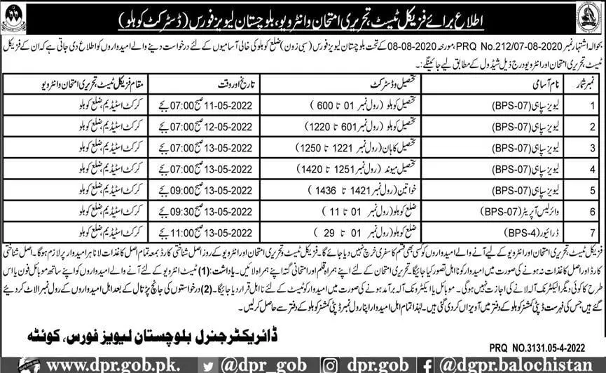 Interview In Balochistan Levies Force khulo announce the Permanent career opportunities for the post of See Below Ad in Balochistan for the fresh and experienced candidates on Permanent basis who have Check Advertisement degree. Posted date of this post is 06/04/2022 and the last date is 13/07/2022. if you are eligible for this job apply before due date.