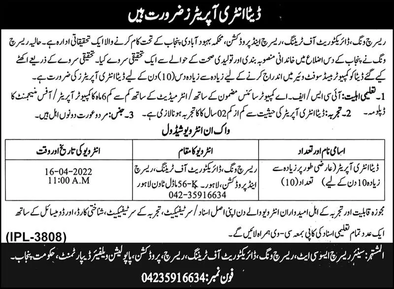 Interview In Population Welfare Department Punjab announce the Contract career opportunities for the post of See Below Ad in Punjab, Lahore for the fresh and experienced candidates on Contract basis who have Check Advertisement degree. Posted date of this post is 08/04/2022 and the last date is 16/04/2022. if you are eligible for this job apply before due date.