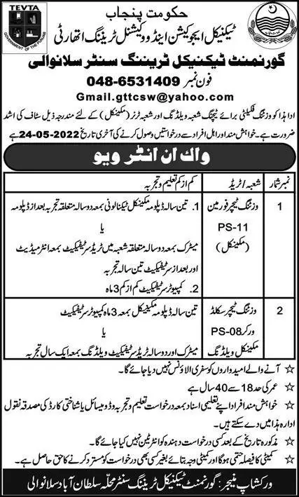 Interview in Technical Education & Vocational Training announce the Contract career opportunities for the post of See Below Ad in Punjab for the fresh and experienced candidates on Contract basis who have Check Advertisement degree. Posted date of this post is 19/05/2022 and the last date is 24/05/2022. if you are eligible for this job apply before due date.