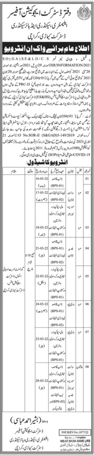 Interview Schedule District Education Officer Jobs 2022 announce the Permanent career opportunities for the post of See Below Ad in Sindh, Karachi for the fresh and experienced candidates on Permanent basis who have Check Advertisement degree. Posted date of this post is 08/03/2022 and the last date is 28/03/2022. if you are eligible for this job apply before due date.