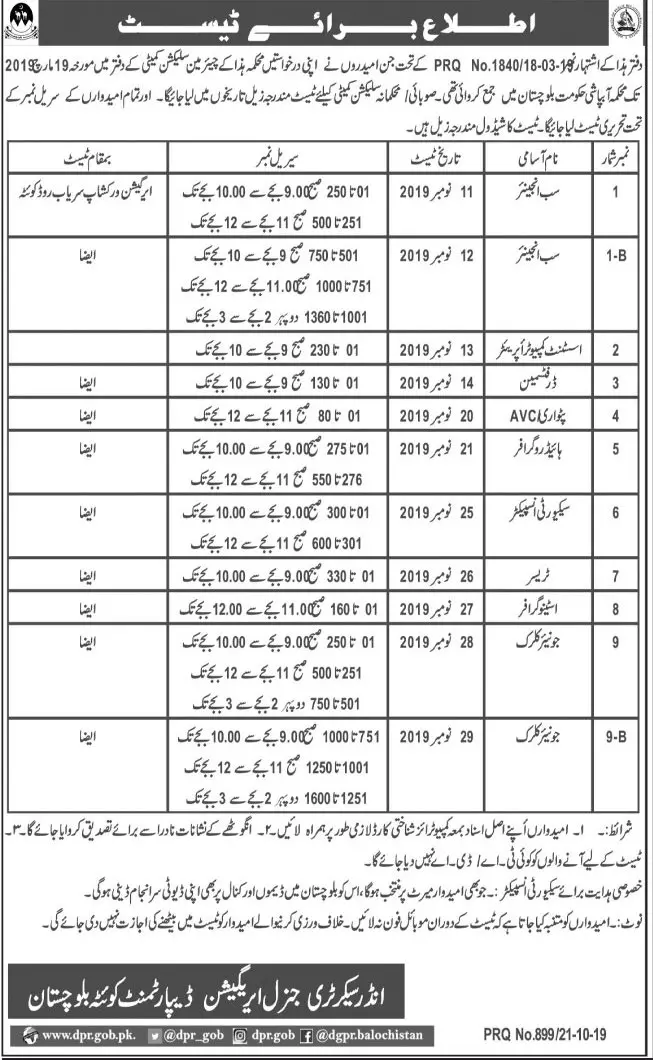 Interview Test Schedule Irrigation Deptt Balochistan