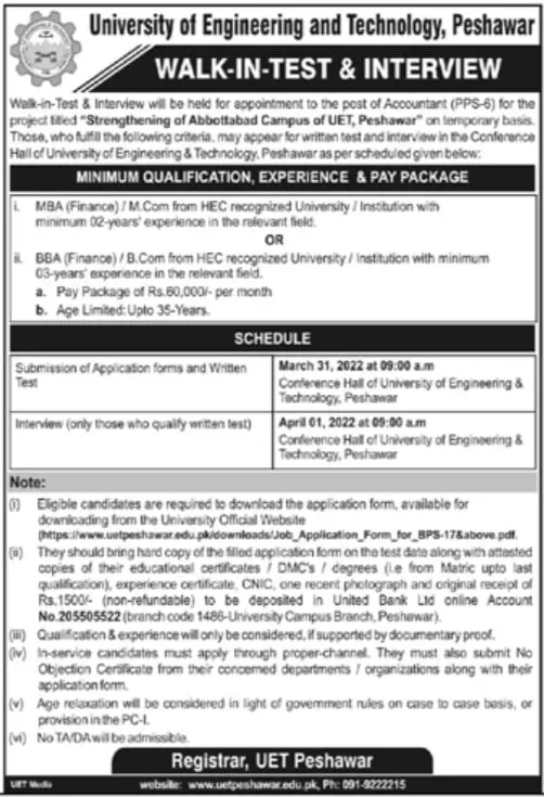 Interview University of Engineering & Technology, Peshawar announce the Contract career opportunities for the post of See Below Ad in Khyber Pakhtunkhwa, Peshawar for the fresh and experienced candidates on Contract basis who have Check Advertisement degree. Posted date of this post is 24/03/2022 and the last date is 01/04/2022. if you are eligible for this job apply before due date.