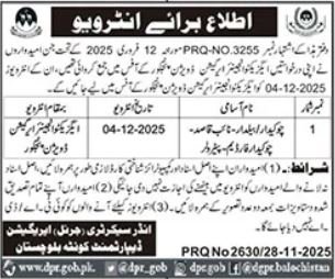 Interviews For Jobs At Irrigation Department Quetta announce the Contract career opportunities for the post of See Below Ad in Balochistan, Quetta for the fresh and experienced candidates on Contract basis who have Check Advertisement degree. Posted date of this post is 29/11/2025 and the last date is 04/12/2025. if you are eligible for this job apply before due date.