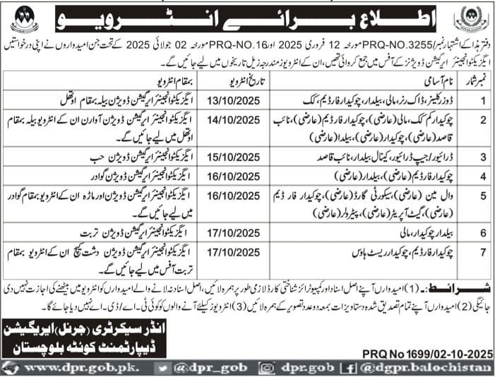 In accordance with this office's advertisement no. PRQ-NO.3255 dated 12 February 2025 and PRQ-NO.16 dated 02 July 2025, the interviews for the candidates who submitted their applications at the office of the Executive Engineer Irrigation Divisions will be held on the following dates.