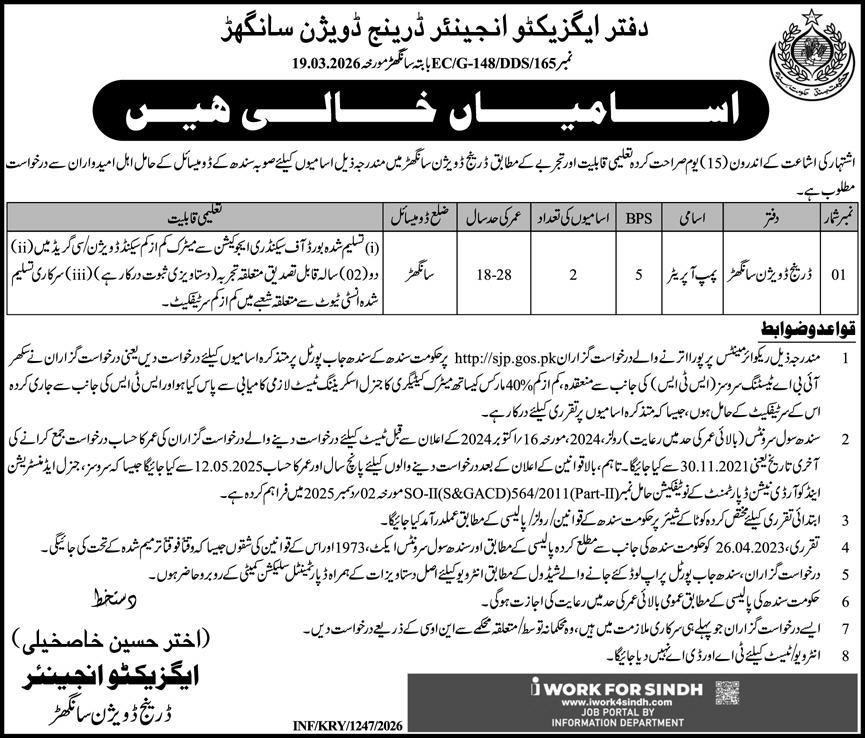 Irrigation Department Drainage Division Sanghar Jobs 2026 announce the Contract career opportunities for the post of See Below Ad in Sindh, Sanghar for the fresh and experienced candidates on Contract basis who have Check Advertisement degree. Posted date of this post is 27/03/2026 and the last date is 11/04/2026. if you are eligible for this job apply before due date.