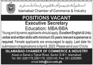 - A post of Executive Secretary is opening in the Islamabad Chamber of Commerce & Industry. Males and Females can both apply.