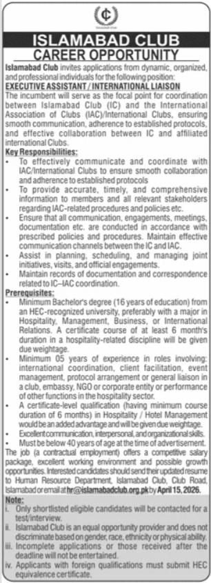Islamabad Club Jobs 2026 announce the Contract career opportunities for the post of See Below Ad in Federal, Islamabad for the fresh and experienced candidates on Contract basis who have Check Advertisement degree. Posted date of this post is 29/03/2026 and the last date is 15/04/2026. if you are eligible for this job apply before due date.