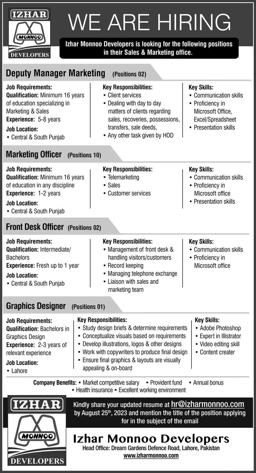 Izhar Monnoo Developers Lahore, lahore Punjab Pakistan invites applications from eligible candidates for the post of deputy manager marketing, marketing officer, front desk officer and graphic designer as per advertisement of August 13, 2023 published in daily Express Newspaper. Persons with Bachelor, Intermediate, BCS, MS, BIT and Master etc. education can apply.