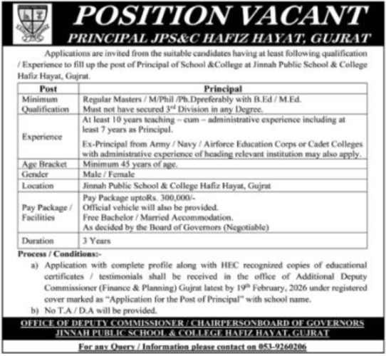 Jinnah Public School & College Gujrat Job 2026 announce the Contract career opportunities for the post of See Below Ad in Punjab, Gujrat for the fresh and experienced candidates on Contract basis who have Check Advertisement degree. Posted date of this post is 06/02/2026 and the last date is 19/02/2026. if you are eligible for this job apply before due date.