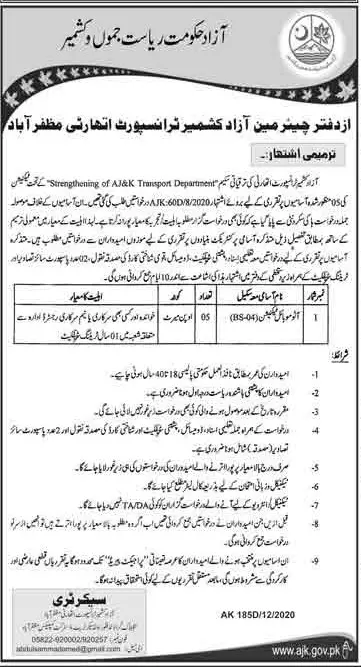 AJK Transport Authority Muzafarabad announce the career opportunities for the post of in for the fresh and experienced candidates on basis who have degree. Posted date of this post is 01/01/2021 and the last date is 10/01/2021. if you are eligible for this job apply before due date.