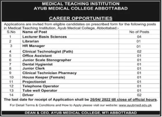 Jobs Ayub Medical College Abbottabad Khyber Pakhtunkhwa announce the Contract career opportunities for the post of See Below Ad in Khyber Pakhtunkhwa,Abbottabad for the fresh and experienced candidates on Contract basis who have Check Advertisement degree. Posted date of this post is 09/04/2022 and the last date is 26/04/2022. if you are eligible for this job apply before due date.