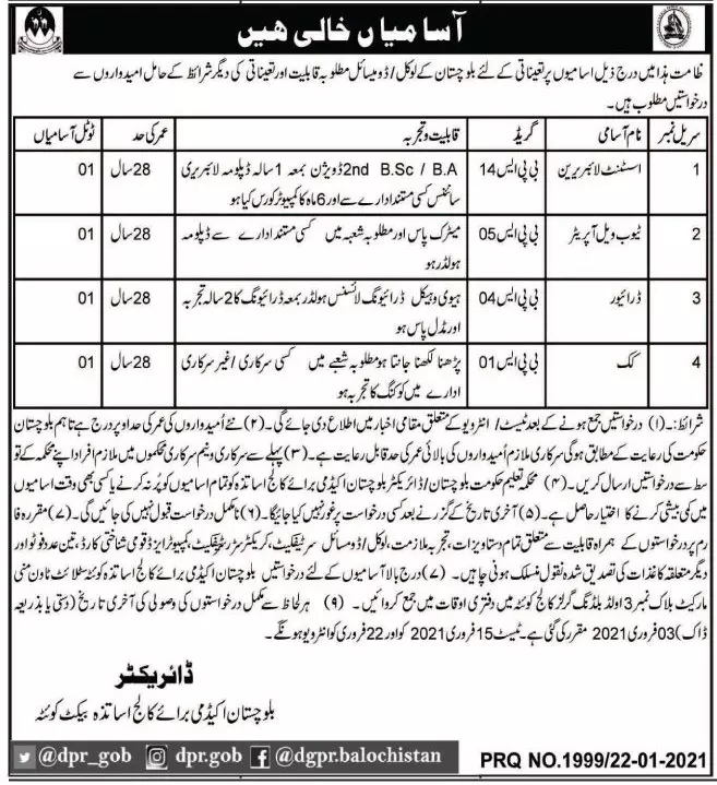 Jobs Balochistan Academy for Teachers Quetta announce the Permanent career opportunities for the post of See Below Ad in Balochistan,Quetta for the fresh and experienced candidates on Permanent basis who have Check Advertisement degree. Posted date of this post is 23/01/2021 and the last date is 03/02/2021. if you are eligible for this job apply before due date.