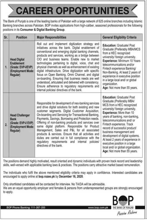 Jobs Bank of Punjab announce the career opportunities for the post of in for the fresh and experienced candidates on basis who have degree. Posted date of this post is 03/12/2020 and the last date is 16/12/2020. if you are eligible for this job apply before due date.