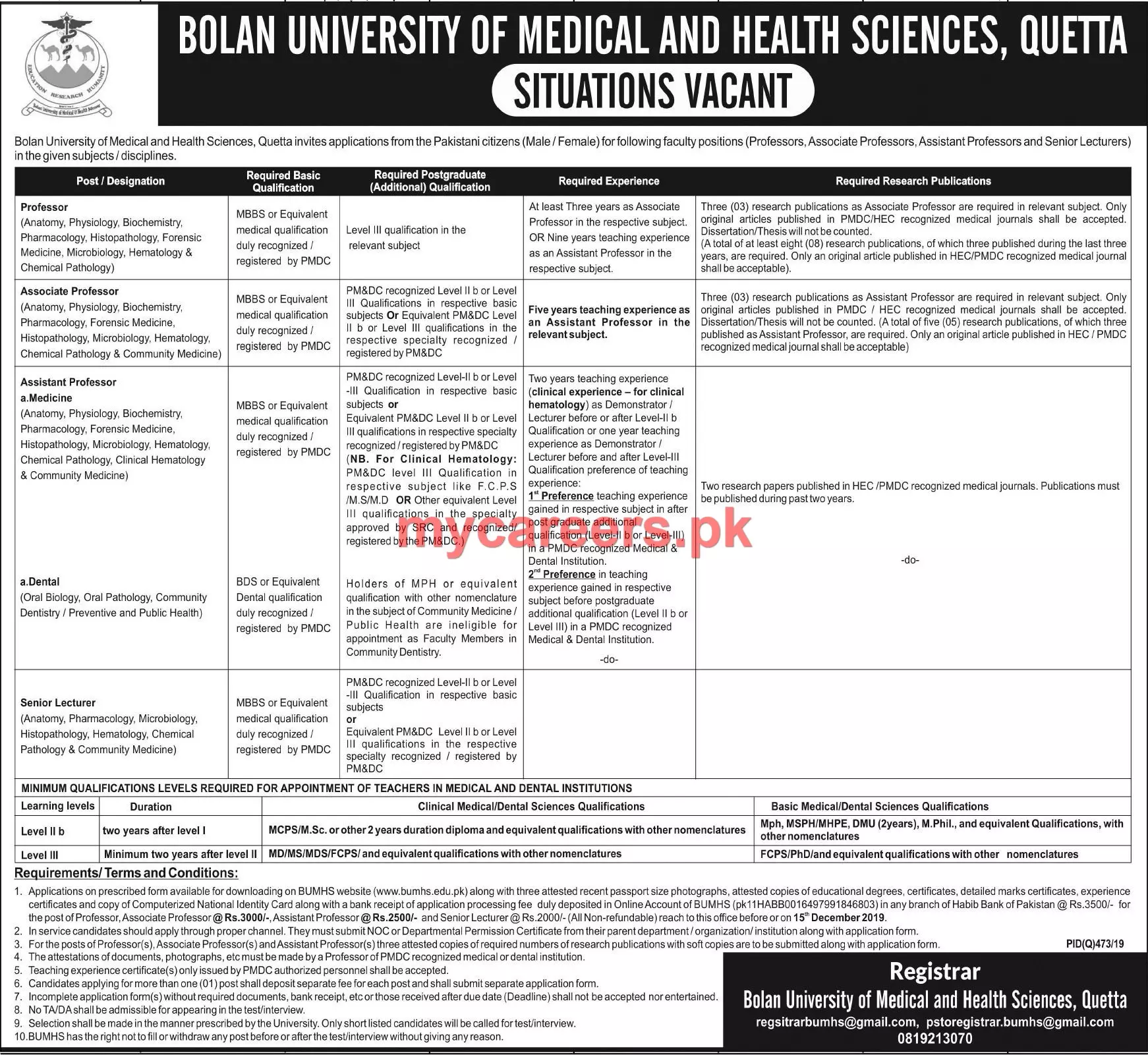 Jobs Bolan University of Medical And Health Sciences Quetta announce the Contract career opportunities for the post of See Below Ad in Federal for the fresh and experienced candidates on Contract basis who have Check Advertisement degree. Posted date of this post is 09/11/2019 and the last date is 15/12/2019. if you are eligible for this job apply before due date.
