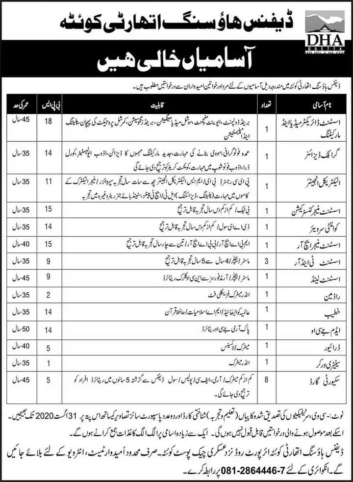 Jobs Defense Housing Authority Quetta ,