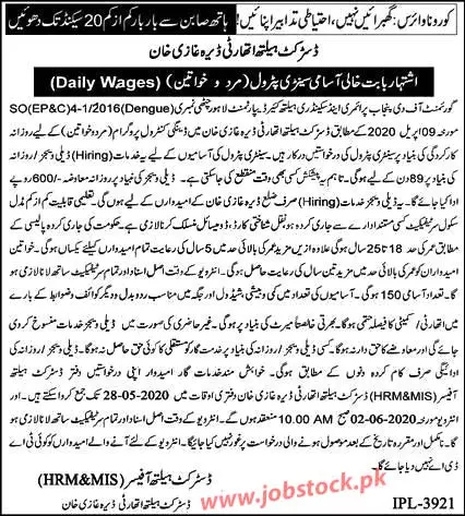 Sanitary Petrol Jobs in District Health Authority Dera Ghazi Khan 2020 Latest. These vacancies is for daily wages for male and female. These all vacancies is for Hiring of Health Office D.G Khan. Education is Middle. Interview will be held on 02-06-2020. IPL-3921