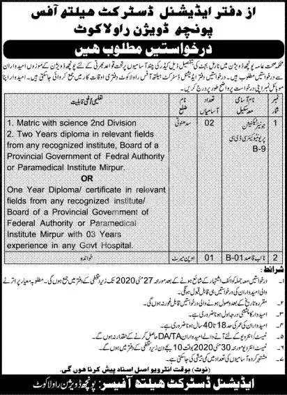 Jobs District Health Office Poonch Rawalakot Ajk announce the Permanent career opportunities for the post of See Below Ad in Azad Jammu Kashmir for the fresh and experienced candidates on Permanent basis who have Check Advertisement degree. Posted date of this post is 14/05/2020 and the last date is 27/05/2020. if you are eligible for this job apply before due date.