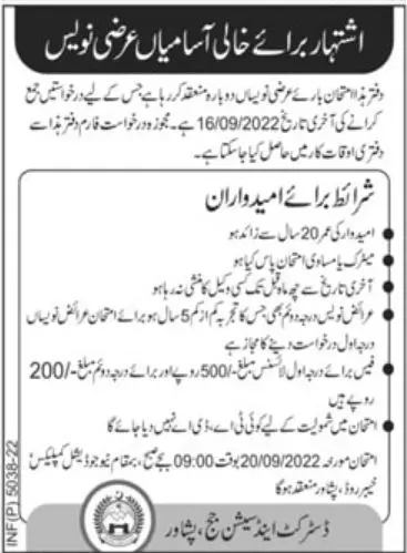 District & Session Court, Peshawar, Khyber Pakhtunkhwa KPK, Pakistan has published an advertisement in the Mashriq newspaper on 02 Sep 2022.