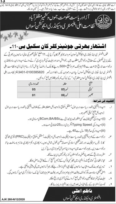 Jobs Elementary & Secondary Education AJK announce the career opportunities for the post of in for the fresh and experienced candidates on basis who have degree. Posted date of this post is 11/12/2020 and the last date is 25/12/2020. if you are eligible for this job apply before due date.