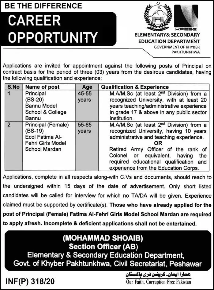Jobs Elementary & Secondary Education Department KPK (2 Ads)